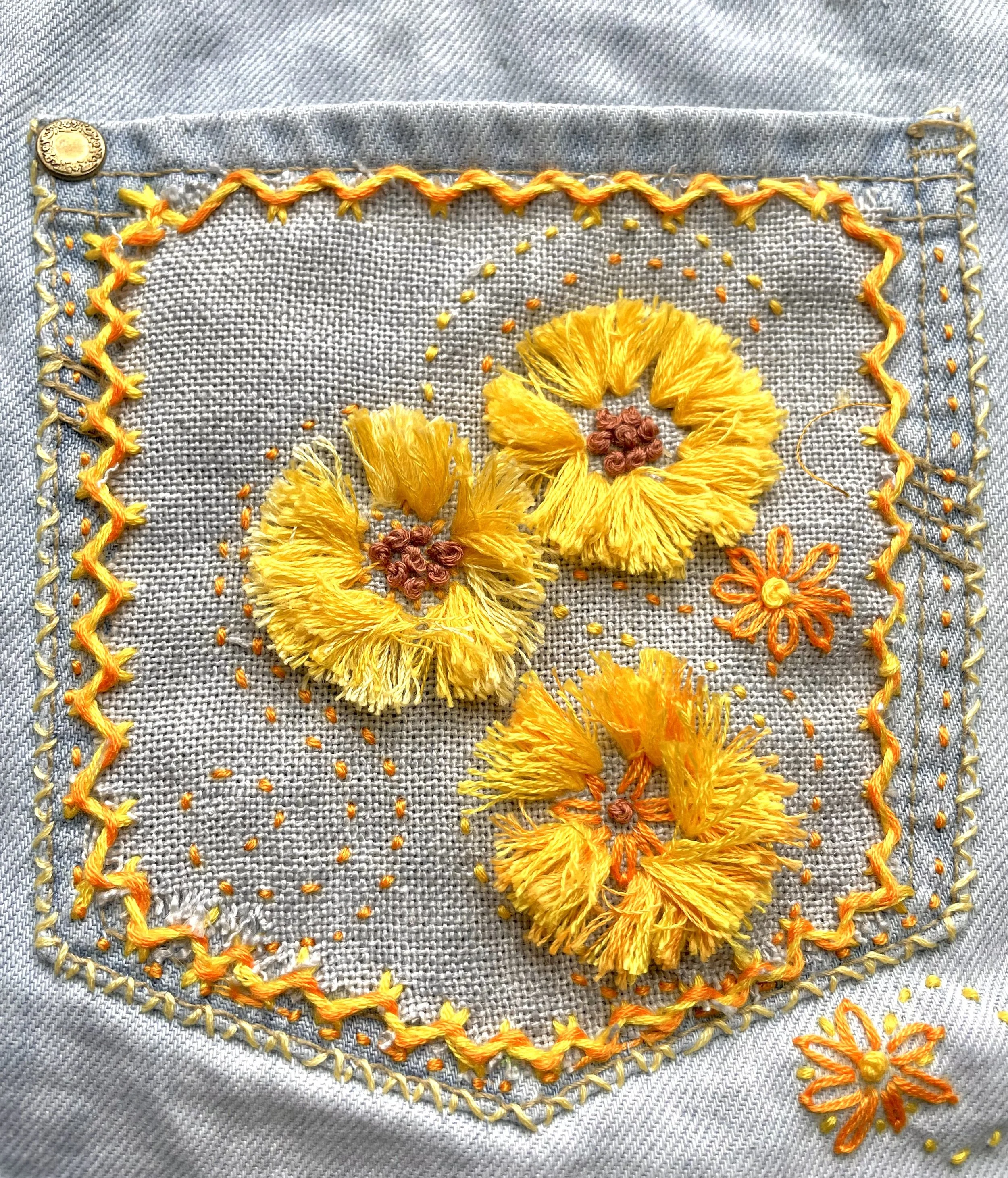 Here are some examples of my own work, and the ways that I have used sustainable stitch to mend, embelish and upcycle garments using the stiches and techniques I teach others at workshops: